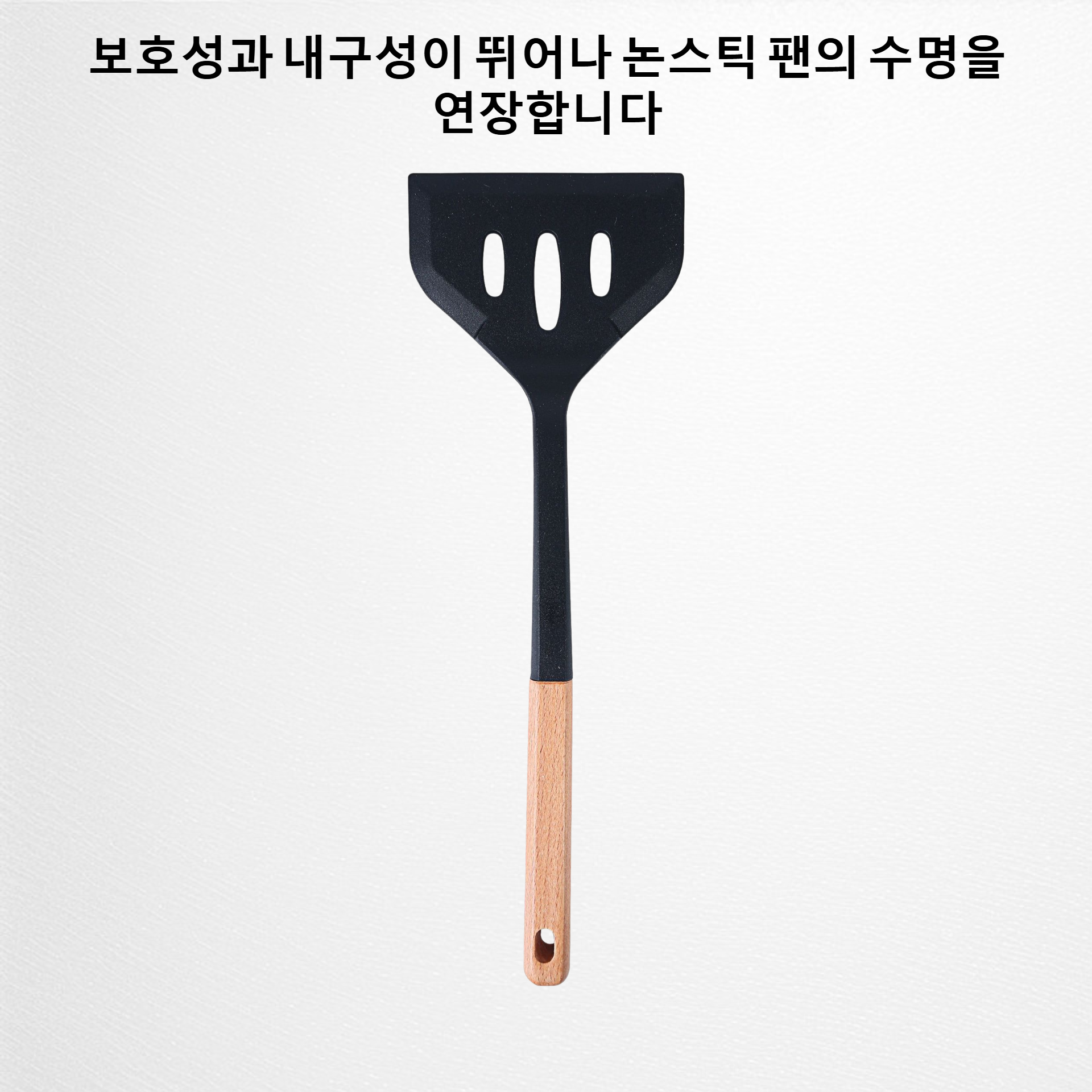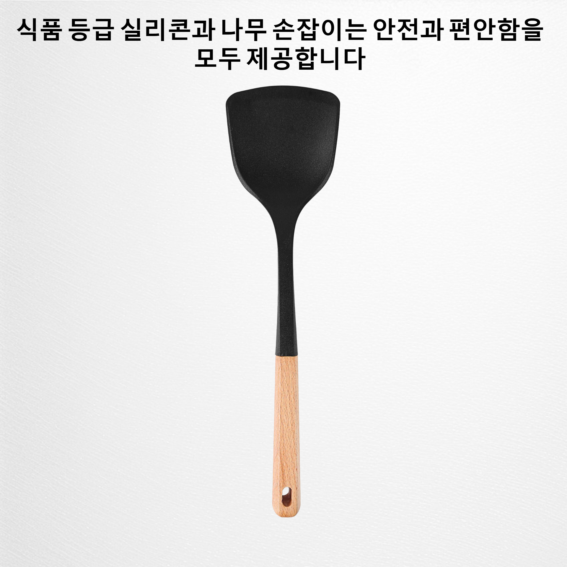 프리미엄 나무 손잡이와 내열성 실리콘 소재로 제작, 위생적이고 세척이 간편함. 긁힘 없이 다양한 요리에 사용 가능, 내구성 우수.