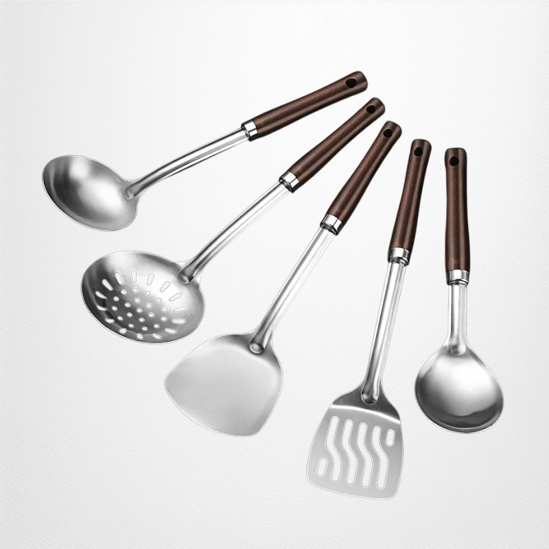 프리미엄 스테인리스 스틸 소재, 내구성 우수, 위생적 사용 가능, 다양한 주방용품 세트 구성, 손쉬운 세척, 녹 방지, 실용적 디자인, 요리 효율성 향상